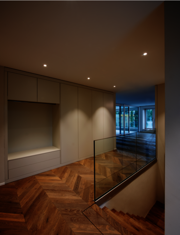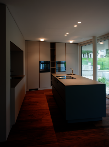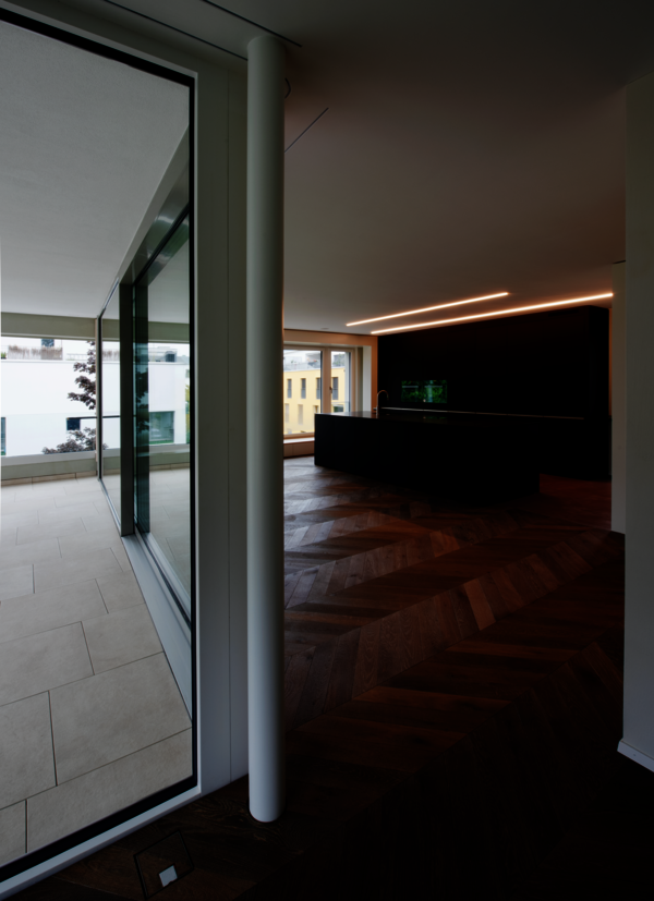 Westseitig ist im EG und 1. OG eine 4.5-Zimmer Maisonette-Wohnung mit Garten angeordnet. Zusätzlich befindet sich im 1. OG eine flexibel unterteilbare Büroeinheit. Sie ist vorwiegend südseitig ausgerichtet und verfügt über einen kleinen Ostbalkon. Die grosszügige 4.5-Zimmer Geschosswohnung im zweiten OG ist mit dem Lift direkt erschlossen. Die räumlich ineinander greifenden Wohn- und Essbereiche integrieren die vollflächig gedeckte Terrasse über eine raumhohe Verglasung.