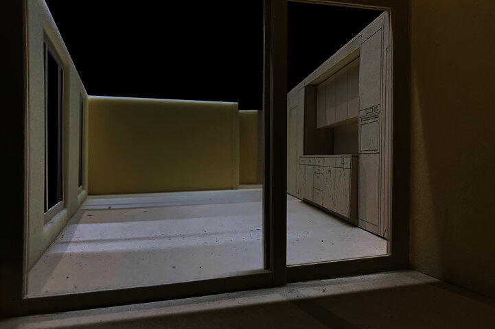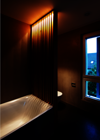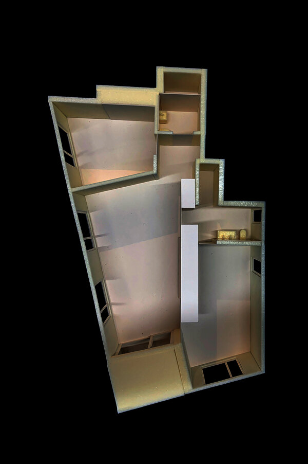 Das Volumen ist geprägt von der trapezförmigen Geometrie der Parzelle. Das dreigeschossige Volumen liest sich als ein zweistöckiger, auskragender Körper der auf einem Sockelgeschoss ruht. Der Materialwechsel - von Holzverkleidung im Erdgeschoss zu Verputz in den Obergeschossen - unterstreicht die volumetrische Aussage und verleiht einen edlen Ausdruck.