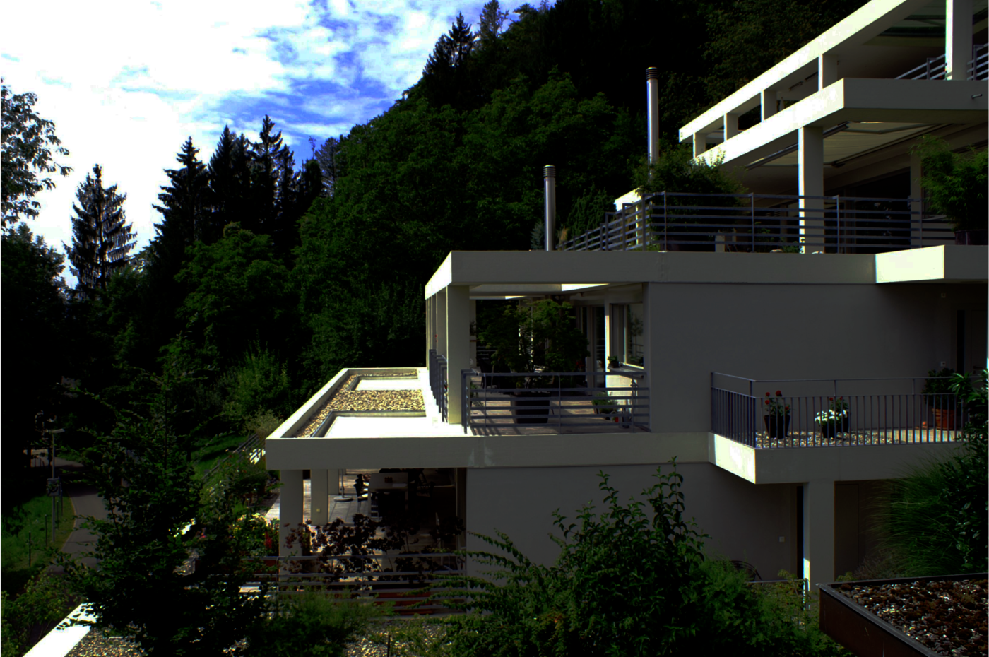Die Erschliessung erfolgt talwärts, von wo das Grundstück zuerst leicht und dann immer steiler ansteigt. Diese Topographie schliesst viele Überbauungsarten aus und prädestiniert eine Terrassenhausanlage.