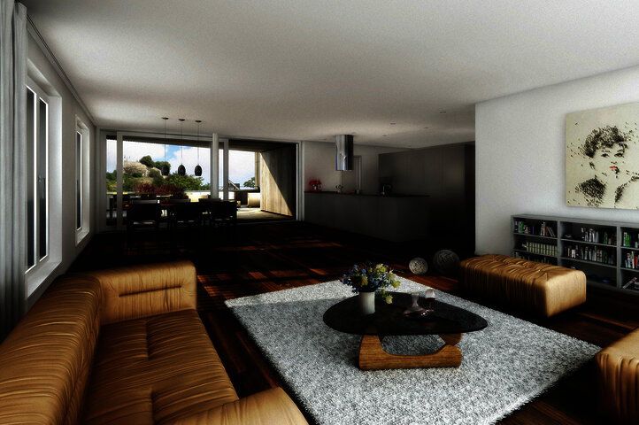 damit einen fliessenden Übergang. Die Gebäudeform wurde aus der Geometrie der Parzelle entwickelt. Im Süden rückt das Projekt um 5.50m von der Strasse weg um die Sichtbeziehung auf die historischen Gebäude Hirzel und Burghalde nicht zu beeinträchtigen. Der im Zuge der