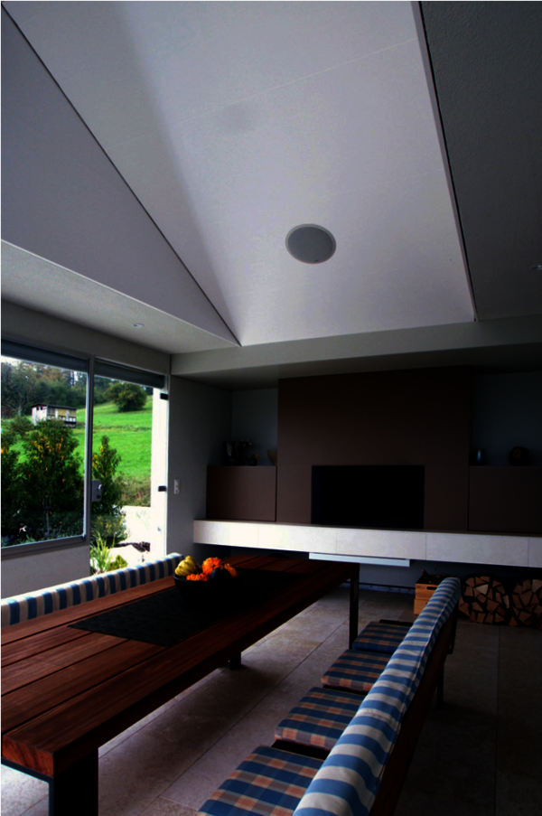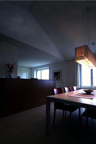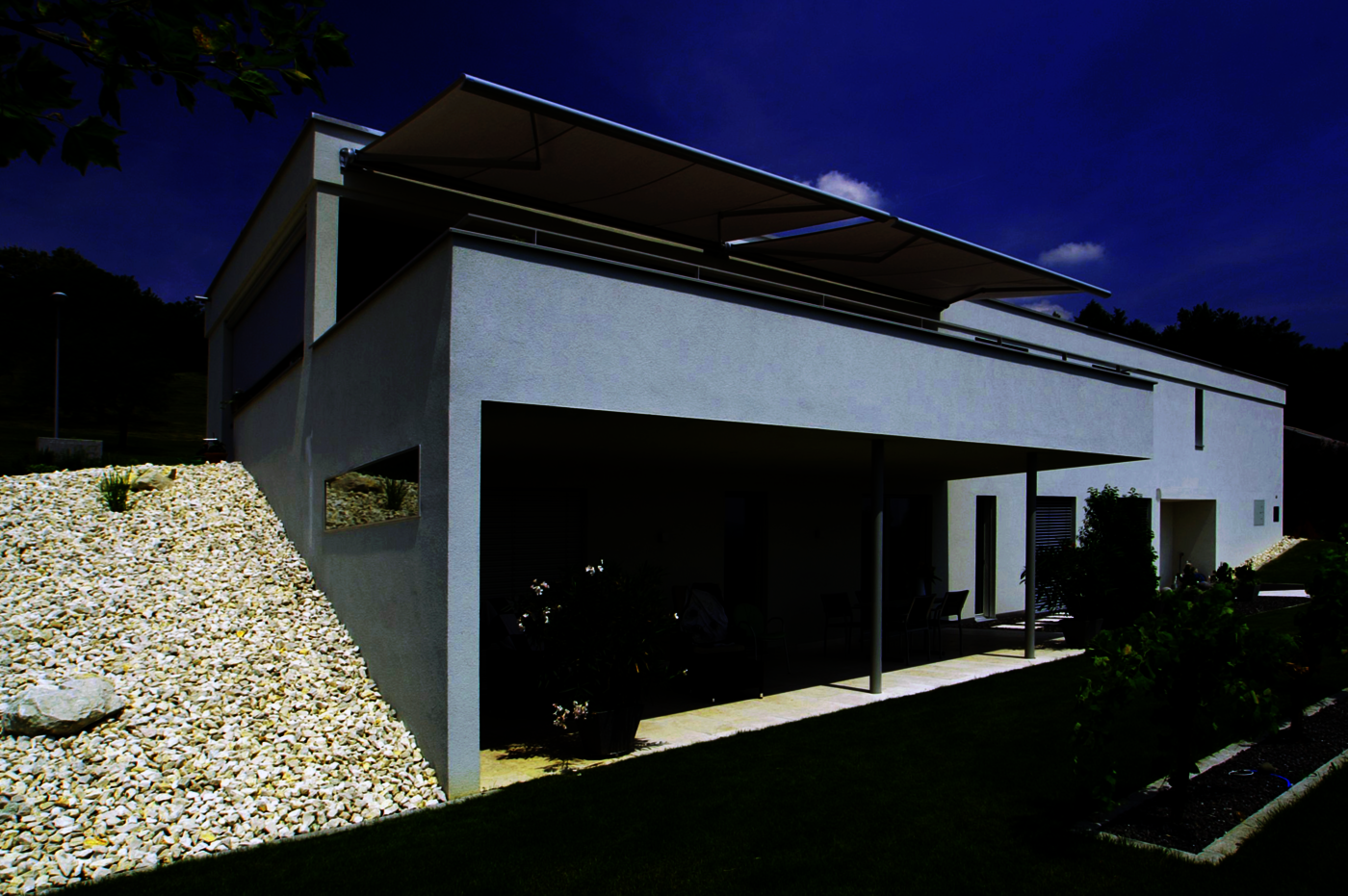 Das Haus liegt an leichter Südhanglage mit beeindruckender Sicht über das untere Aaretal - vom Schloss Lenzburg bis nach Aarau - und bei entsprechender Wetterlage bis in die Alpen. Das schlichte Gebäude mit leicht zurückversetztem Satteldach ist schmal und langgezogen. Die Doppelgarage ist vollständig im Baukörper integriert. An der Südwestecke erweitert ein einstöckiger Terrassenanbau das Volumen. Der Zugang erfolgt hangseitig und führt direkt in den Wohn-/Essbereich, der aufgrund der Dachschrägen ein grosszügiges Raumgefühl vermittelt. Die angrenzende überdeckte Terrasse bietet einen attraktiven Aussenwohnbereich mit Cheminée, der beinahe das ganze Jahr genutzt werden kann. Im Untergeschoss befinden sich zwei Schlafzimmer. Eines verfügt über eine Ankleide und eine integrierte Nasszelle, die über ein Atrium belichtet werden. Dem zweiten Schlafzimmer ist ebenfalls ein eigenes Badezimmer zugeordnet. Wie alle Räume, profitiert auch der grosse Multifunktionsraum vom direkten Zugang zum Garten.