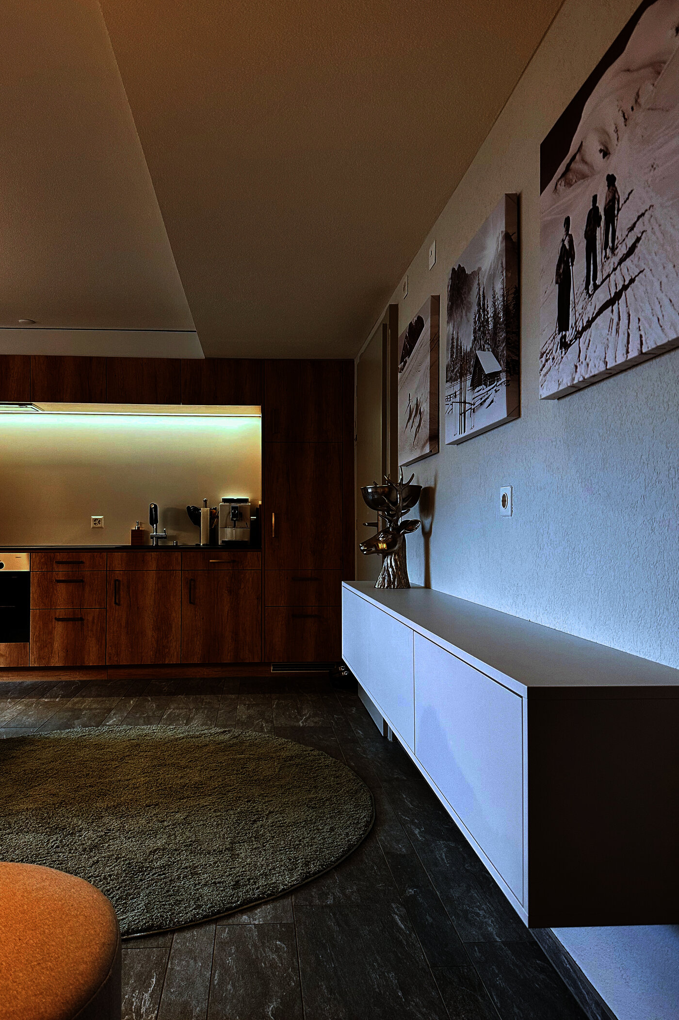 Die Auffrischung einer 2.5 Zimmer-Ferienwohnung in Saas Grund beinhaltete die Erneuerung der Oberflächen und die Neugestaltung von Einbauten.