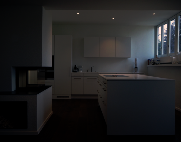 Die Anbindung eines Zimmers an den Wohnbereich vergrösserte die Wohnfläche beinahe um die Hälfte und erlaubte den Einbau einer grosszügigen Inselküche. Die Feuerstelle - ebenfalls als Insel gestaltet - liegt zentral und ist von verschiedenen Standorten und Blickwinkeln erlebbar. Der dunkle Boden und die weissen Einbauten verleihen dem Raum Grösse und Eleganz.